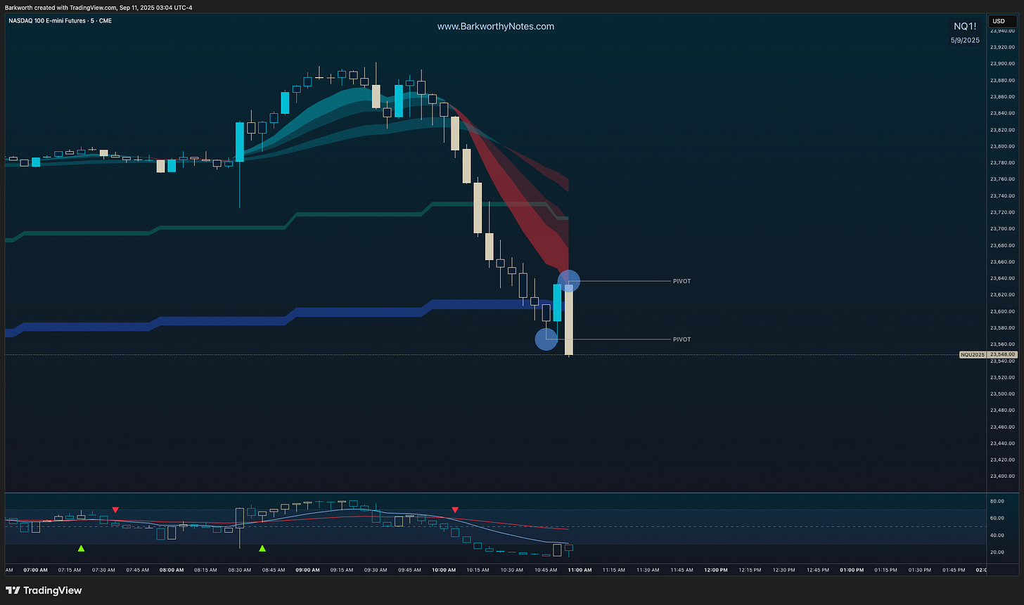 This is where it gets interesting, because we do have two pivots, but no clean trend structure to define higher lows and lower highs. On M5, we only see a lower high and a bearish engulfing candle, while the process isolated the wick as a pivot by definition.