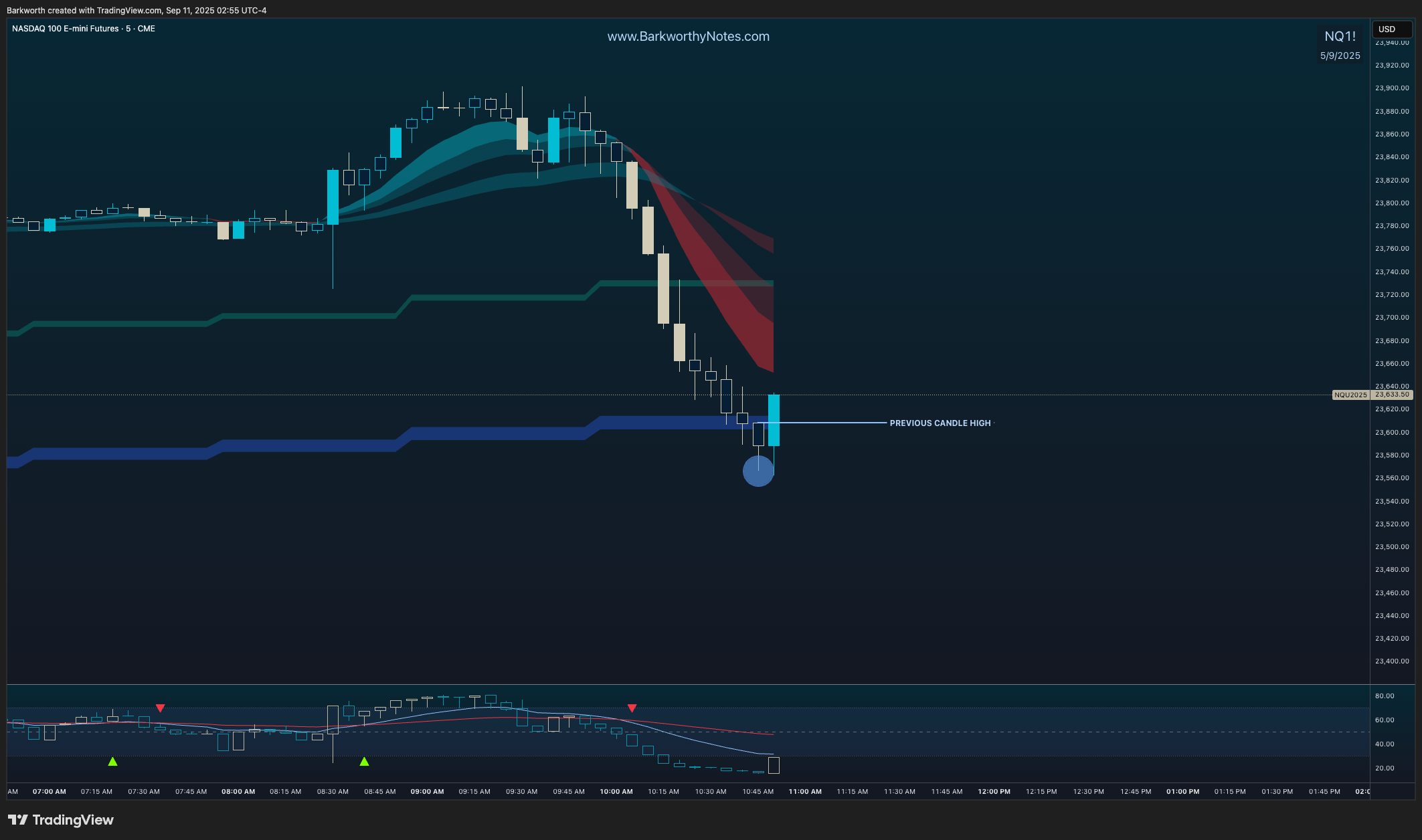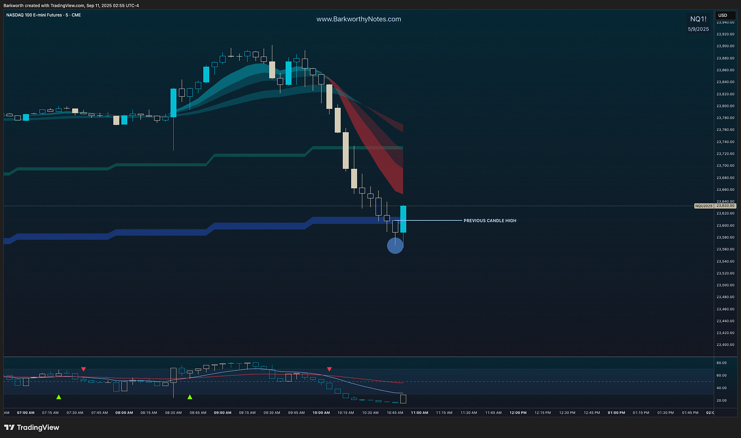 In the chart below, you see an M5 EMA9 downtrend, and price has just confirmed a low to backtest the EMA9, looking for rejection to confirm a lower high. The ‘outside candle’ confirms the pivot.
