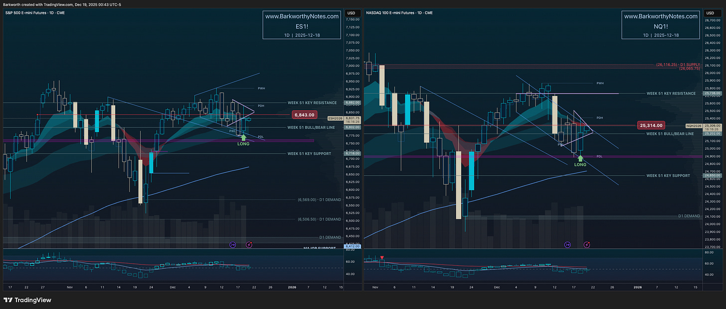 Still playing for a Santa Rally this week. Markets are undercutting Monday/Tuesday’s bottoms. Yesterday’s plan was to reclaim, today’s plan is to squeeze.