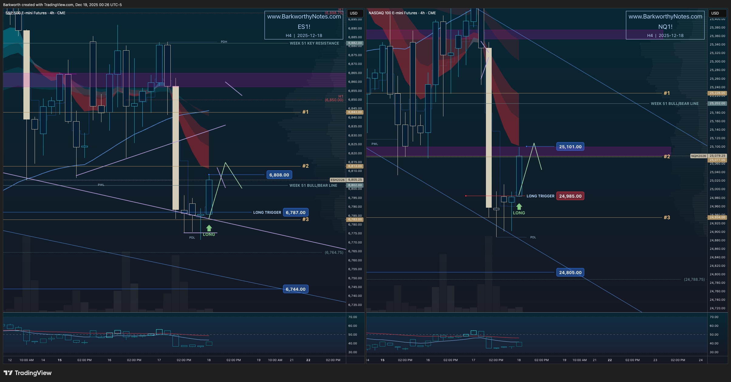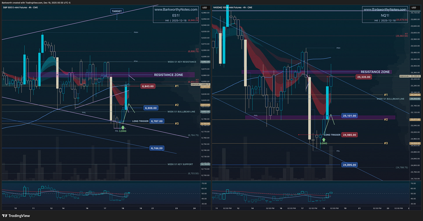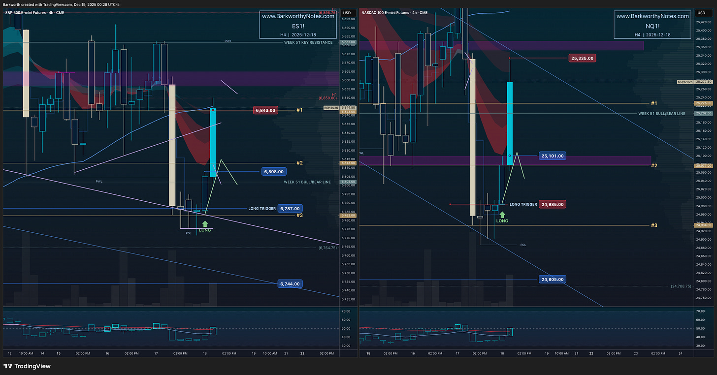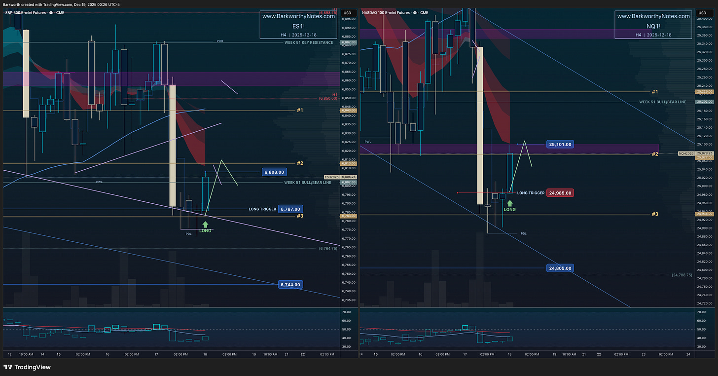 “Before buyers can reclaim, they have to backtest. The 4 hourly timeframe is setting up the “breakdown backtest long” - that targets ES $6805-$6813 / NQ $25080-$25117.”